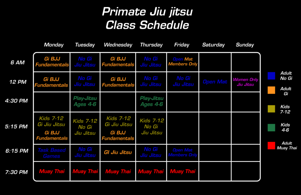 Schedule Sign up to try a FREE class with the buttons below AdultsKids 7-12Play-Jitsu 4-6Muay ThaiWomen Only Class